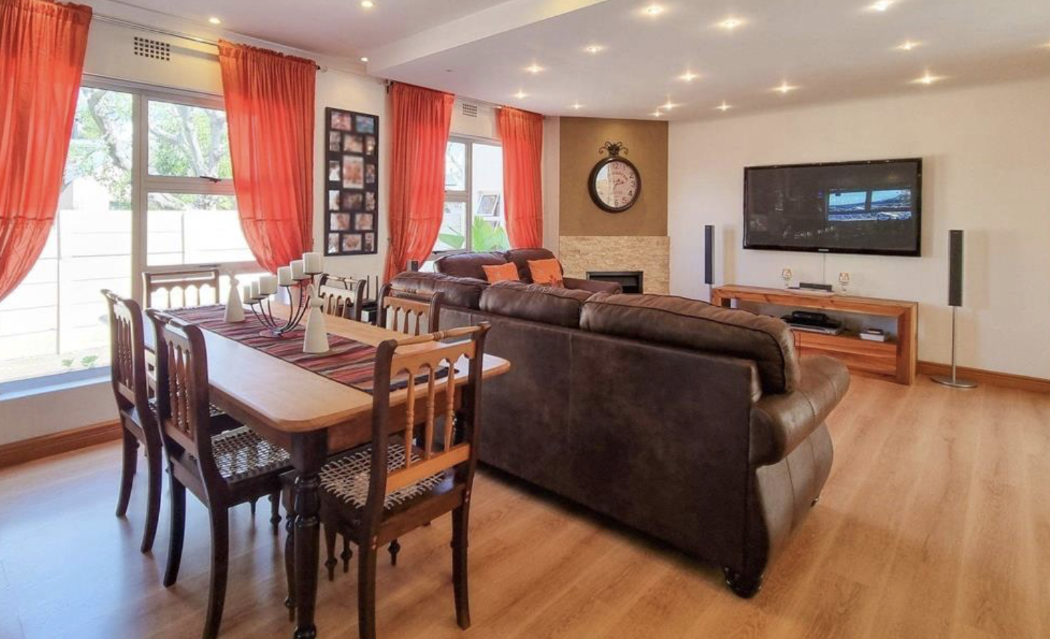 Generous open-plan lounge and dining area featuring stylish recessed lighting, a cozy fireplace, wood-look laminate floors, and glass sliding doors opening to the covered pool patio.