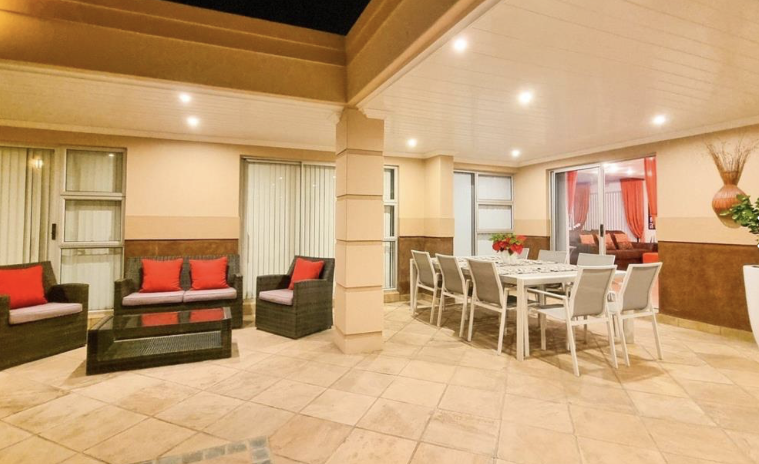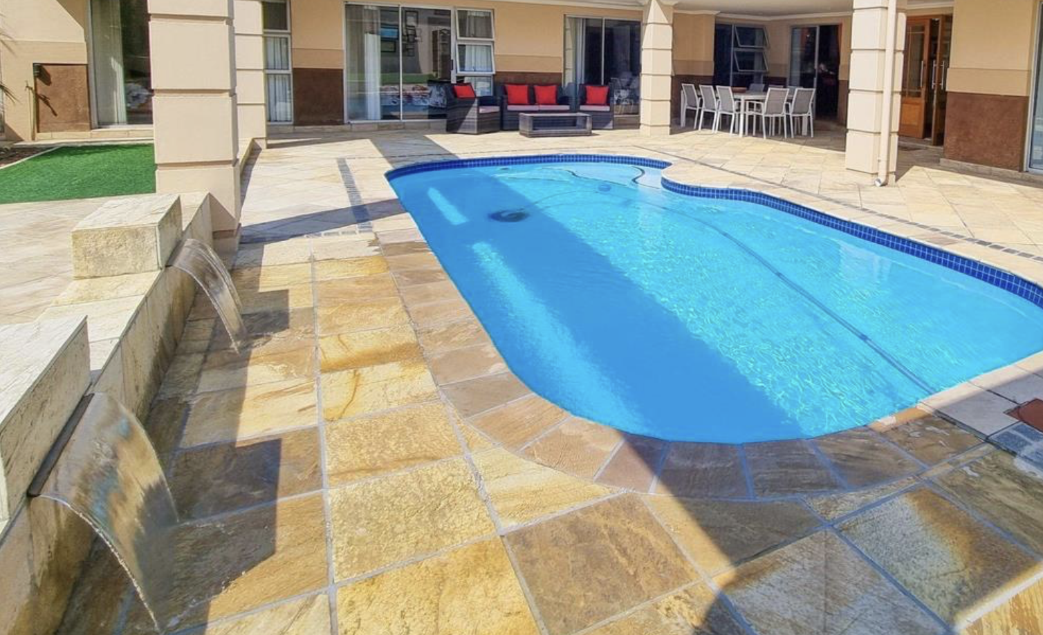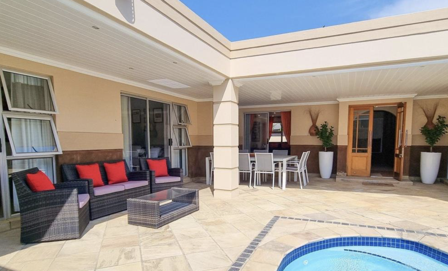 Expansive L-shaped covered patio beside the pool, perfect for private gatherings and relaxation. Separate poolside braai zone complete with built-in barbecue and preparation surfaces.