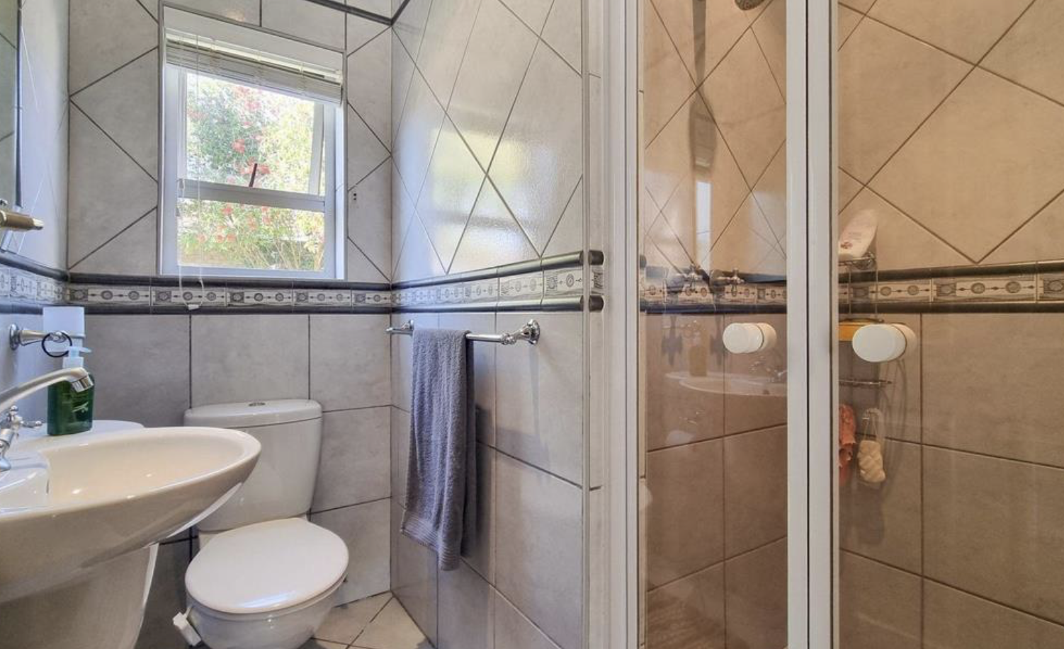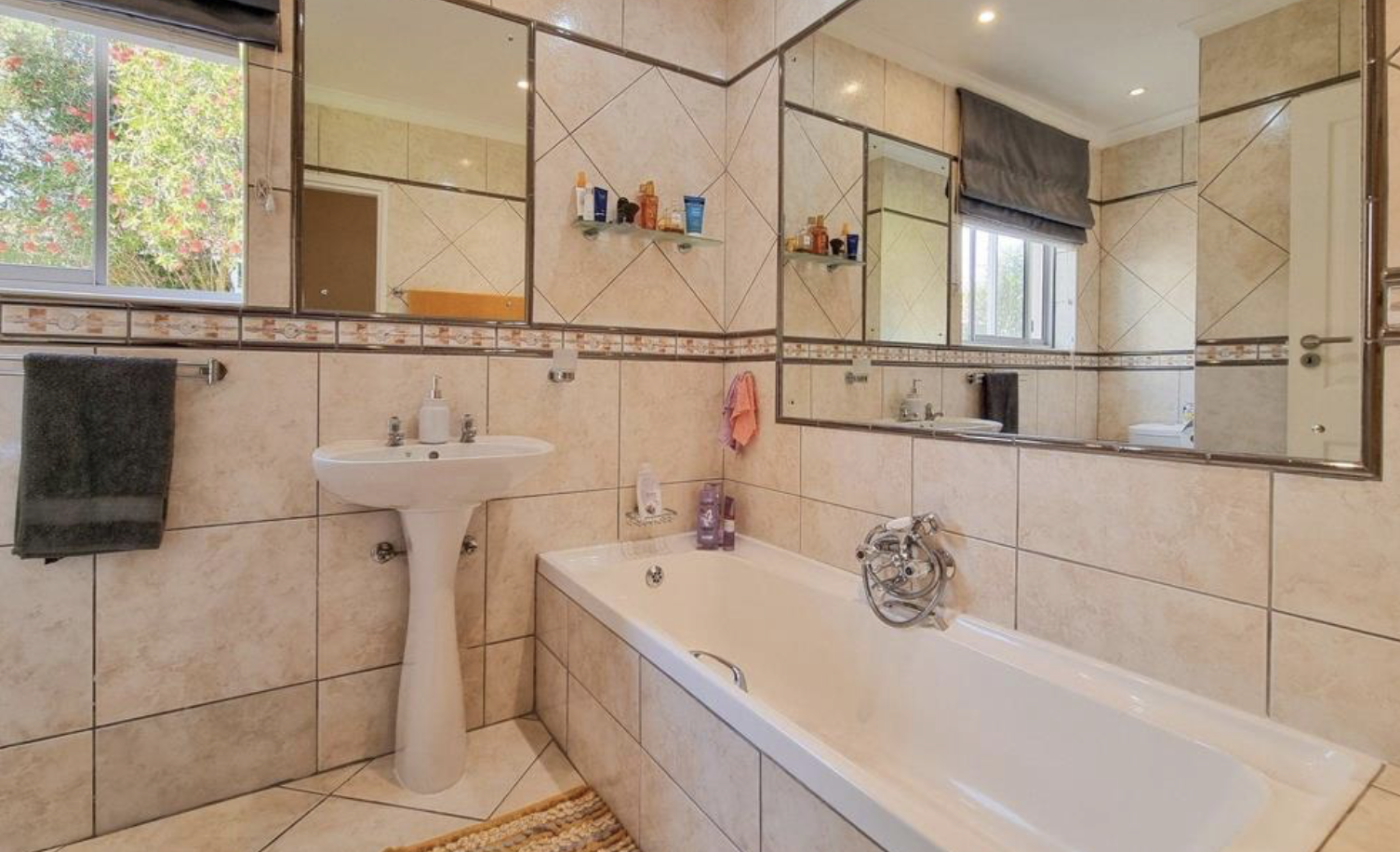 Two additional family bathrooms: one with bath, basin & toilet; the other with shower, basin & toilet — both fully tiled to ceiling.